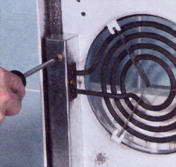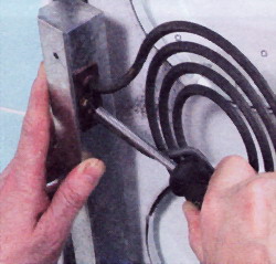 ❻ Открутите винт в центре крепежной накладки. Винт там всего один и находится рядом с местом крепления конфорки.