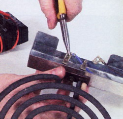 Монтаж новой конфорки производится в обратном порядке. Так как вы подобрали конфорку точно по размеру, то контакты новой конфорки легко войдут в освободившиеся отверстия монтажной планки. Ранее сделанное фото схемы соединения поможет правильно подсоединить провода. Затем останется вернуть на место монтажную планку, металлическую подставку под конфорку и затянуть винты, на которых держалась монтажная планка. Если вы всё сделали правильно, конфорка электроплиты при включении начнет нагреваться.