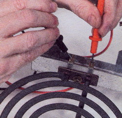 ❺ Прозвоните конфорку тестером. Если включенный прибор не реагирует на измерения, значит, ваши предположения оказались верны и конфорка, действительно, неисправна.